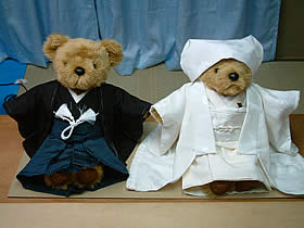 2002年11月、和裁掲示板に貴美さんという方からウェディングベアー(和装)を作りたいのですが、どうしたらいいでしょうか?という投稿がありました。結婚する友人から、「クマちゃんに白無垢を作って。」と頼まれたのだそうです。