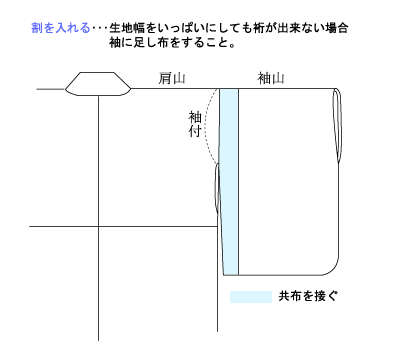 裄の長い人はキングサイズ等、幅の広い反物を使いますが、普通の反物やアンティークなど昔の反物で仕立てると裄が短くなるので、足し布をします。 共布で接ぐ場合、 掛け衿を使います。主衿はつまんで掛け衿にみせかけ、掛衿の部分は1枚になるので、下に金巾や晒を入れます。 または、衽の縫込みを使います。羽織やコートと同じやり方ですが、欠く幅は身幅とのかねあいを見て決めます。 普通は共布を使いますが、アクセントになるように別布で接ぎを入れる場合もあります。接ぐのはミシンで縫って割ると目立たなくきれいに仕上がります。