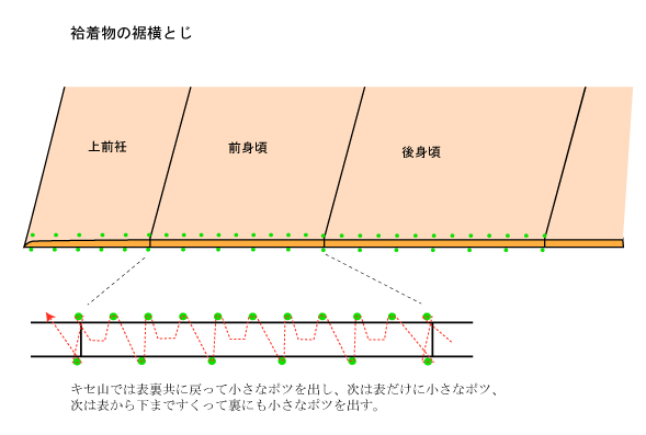 表に返して表に1分のキセをかけ、躾をかけます。裾の吹きを決め背、脇、衽線の位置で待ち針を打ちます。吹きの幅は1分より少し細い目が綺麗です。両前後の裾の吹きを揃えながら横とじを入れます。衽の横とじは衿下をくけた後で入れます。